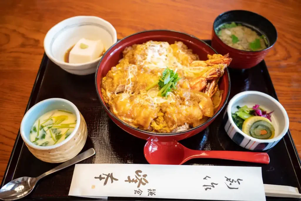鎌倉丼は、エビの天ぷら、もしくは海老フライなどを卵で綴じて丼飯の上に載せたものです。鎌倉の海で伊勢海老が、昔良く獲れたので、作られたようです。