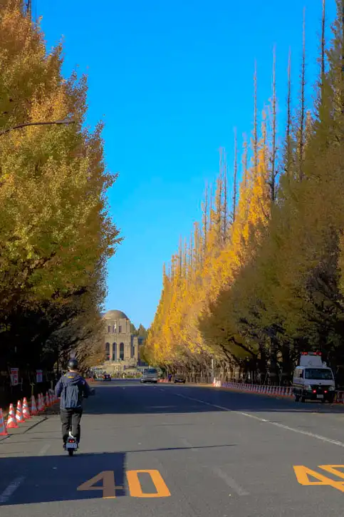 青山通りから聖徳記念絵画館に向かって続く、有名な並木道。146本のイチョウが植えられ、秋には黄金色のトンネルとなり、とても綺麗です。