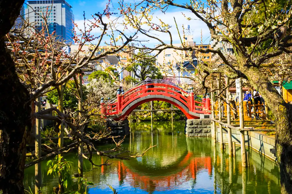 九州太宰府天満宮にならって造られたという社殿、回廊、心字池、太鼓橋が配置された見事な杜は、東国天満宮の宗社として有名です。