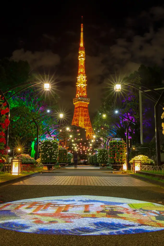 芝公園ではドレスのような立体花壇や東京タワーを背景にした幻想的なライトアップを楽しむことができます。