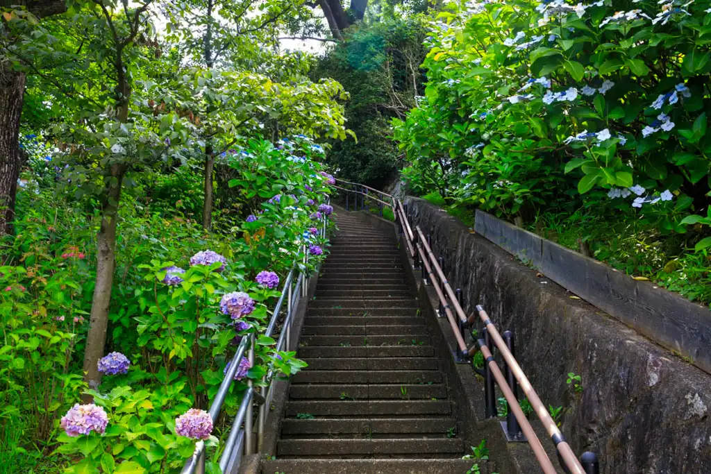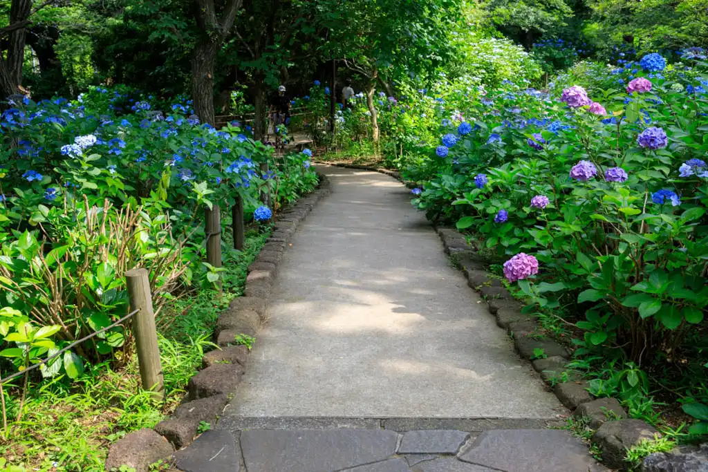 桜、あじさいなど四季折々の花や自然林の道の散策が楽しめます。