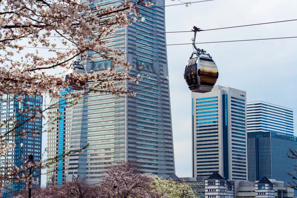 運河パークの最大の見どころは、「桜・近代建築・ロープウェイ」を1枚のフレームに収められる点です。 公園沿いにはソメイヨシノが植えられており、そのすぐ上を近未来的なデザインのキャビン(ゴンドラ)がゆっくりと通過していきます。背後には横浜ランドマークタワーなどの摩天楼がそびえ立ち、まさに「今の横浜」を象徴するカットが狙えます。