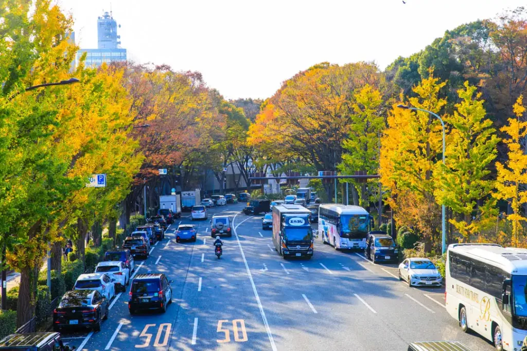 帰り道、銀杏並木が綺麗だったので、撮ってみました。歩道橋の上からの撮影です。